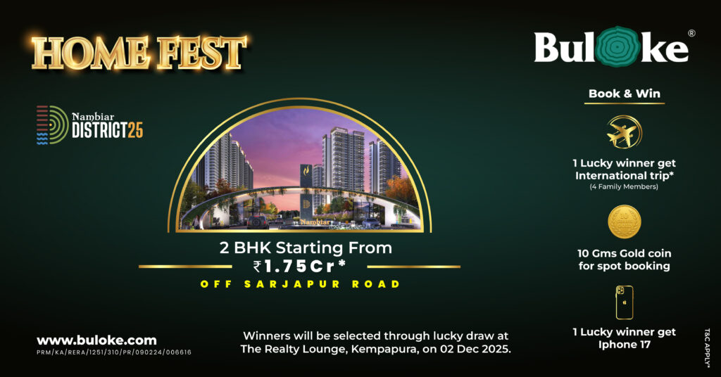 Nambiar District 25 is an ultra luxury residential apartment located off Sarjapur Road near Muthanallur Cross, Dommasandra in East Bangalore. Spanning 100 acres with 75 acres dedicated to residential development, this expansive project offers thoughtfully designed 2, 2.5, 3, 3.5 & 4 BHK apartments. With only 4 units per floor and 4 elevators per tower, homes are crafted for privacy, space, and comfort.